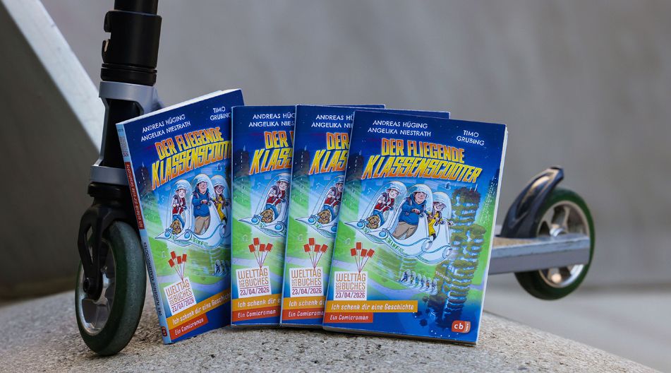 Schulen können sich ab dem 25. November 2025 für die deutschlandweit größte Leseförderungsaktion „Ich schenk dir eine Geschichte“ zum Welttag des Buches anmelden und so Schulkindern die Chance auf ein kostenloses Exemplar des neuen Welttag-Comicromans „Der fliegende Klassenscooter“ vom Autorenduo Andreas Hüging und Angelika Niestrath sowie Illustrator Timo Grubing sichern.