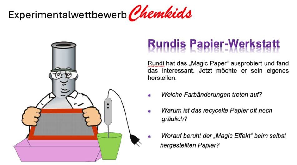 Das Team des Experimentalwettbewerbs Chemkids hat aufregende Neuigkeiten für alle Schülerinnen und Schüler. Die Herbstrunde des Wettbewerbs steht vor der Tür und es wurden spannende neue Aufgaben ausgetüftelt. Dieses Mal dreht sich alles um das Thema "Rundis Papier-Werkstatt". Taucht ein in die wunderbare Welt des Papierschöpfens und stellt euer eigenes „Magic Paper“ her. Das Chemkids-Team hat für euch herausfordernde Experimentieraufgaben zusammengestellt und Rundi, das Maskottchen, ist schon aufgeregt und kann es kaum erwarten, eure kreativen und experimentellen Arbeiten zu bewundern.