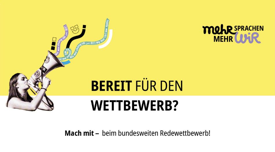 Nach einem erfolgreichen Start im Schuljahr 2024/25 findet der mehrsprachige Redewettbewerb "Mehr Sprachen – mehr WIR" im kommenden Schuljahr zum zweiten Mal statt. Er wird von der Deutschen Kinder- und Jugendstiftung ausgerichtet und von der Beauftragten der Bundesregierung für Migration, Flüchtlinge und Integration, zugleich Beauftragte der Bundesregierung für Antirassismus gefördert. Ziel ist, Mehrsprachigkeit im Kontext Schule und in der öffentlichen Wahrnehmung positiver zu positionieren.