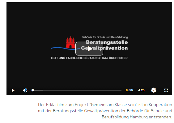 Der Erklärfilm zum Projekt "Gemeinsam Klasse sein" ist in Kooperation mit der Beratungsstelle Gewaltprävention der Behörde für Schule und Berufsbildung Hamburg entstanden.
